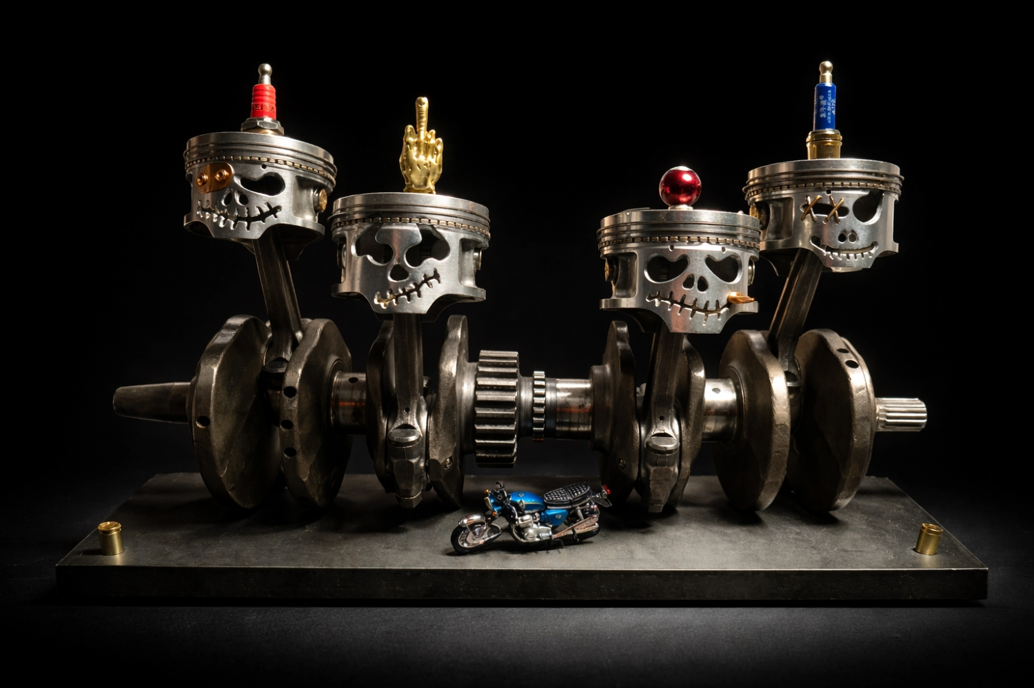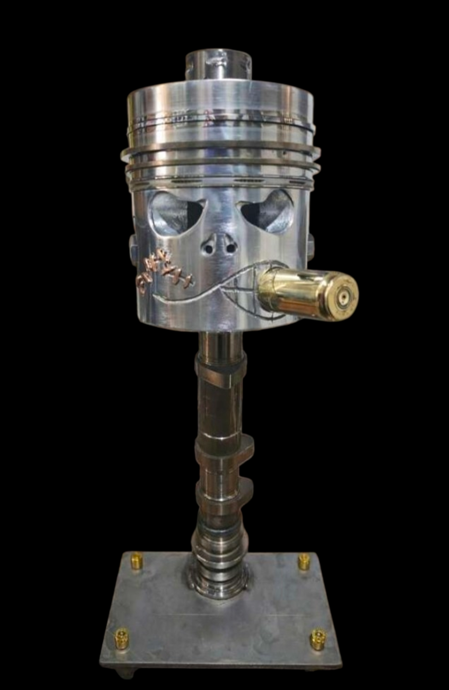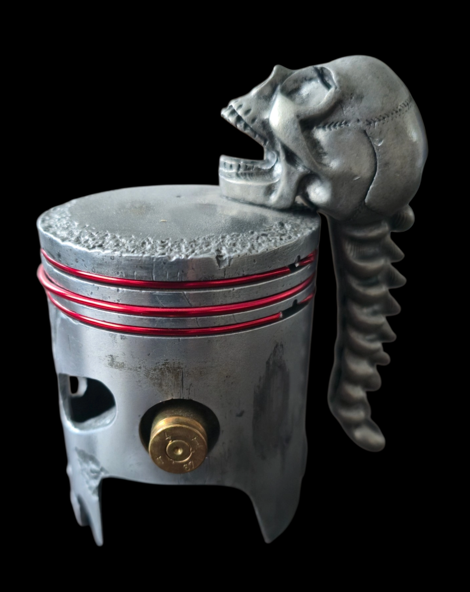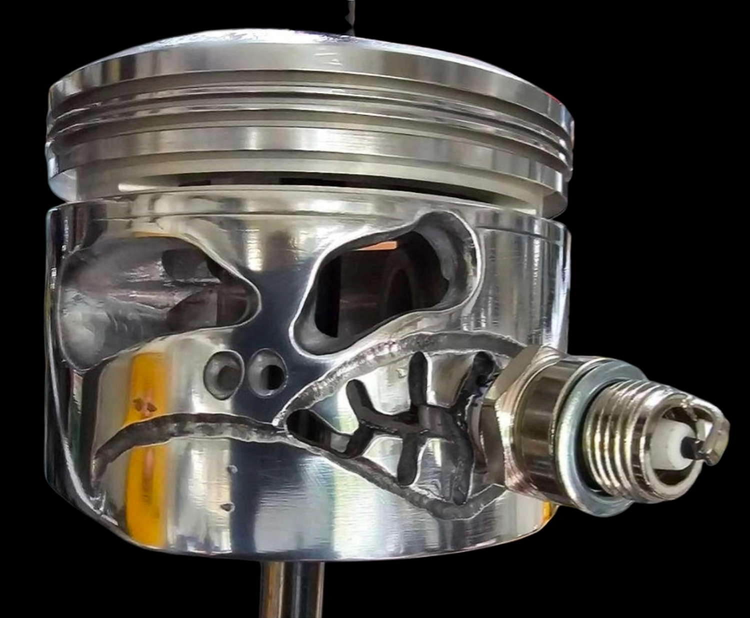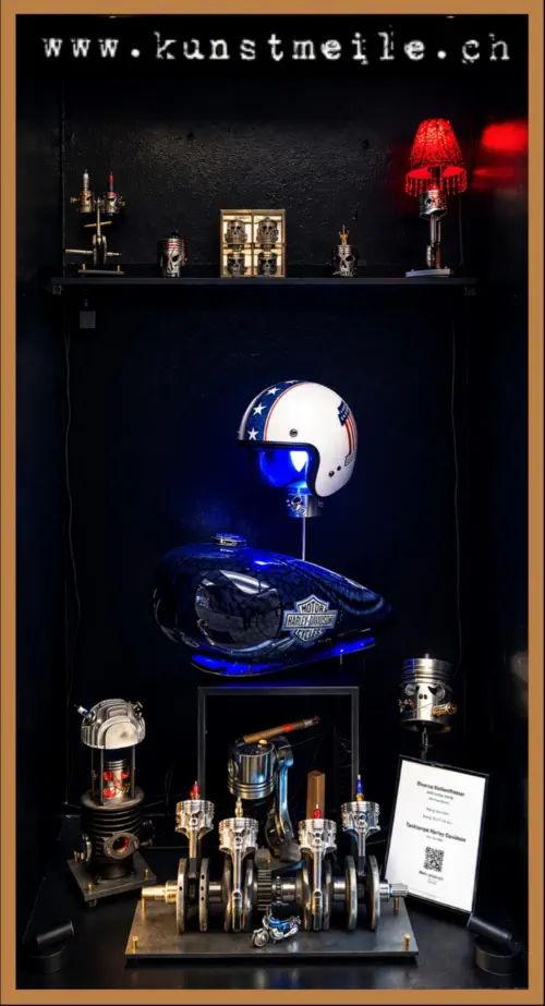 passend dazu ein 1340er Harley Shovelhead Kolben aus den 70er Jahren unter dem Helm,