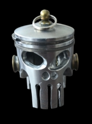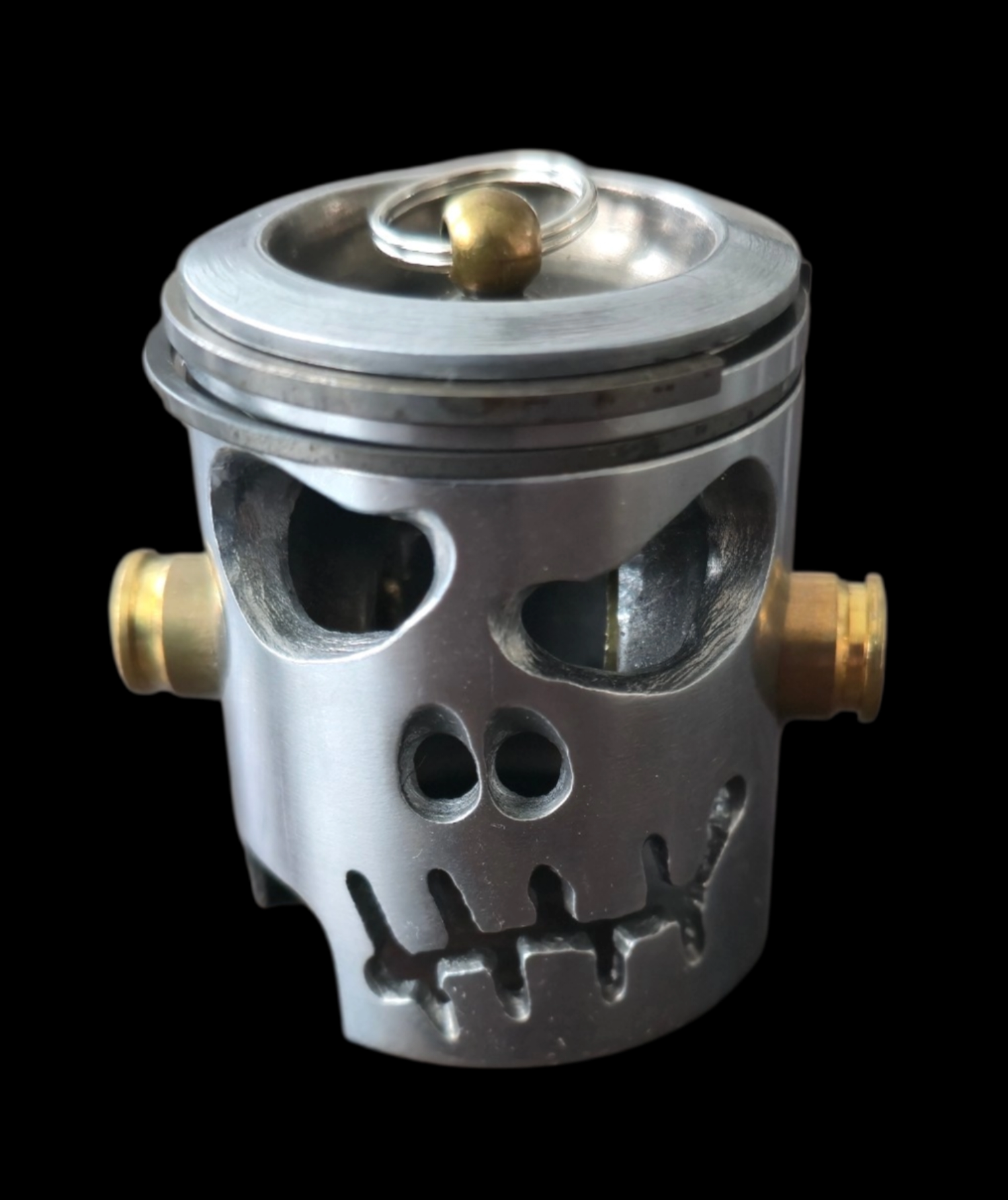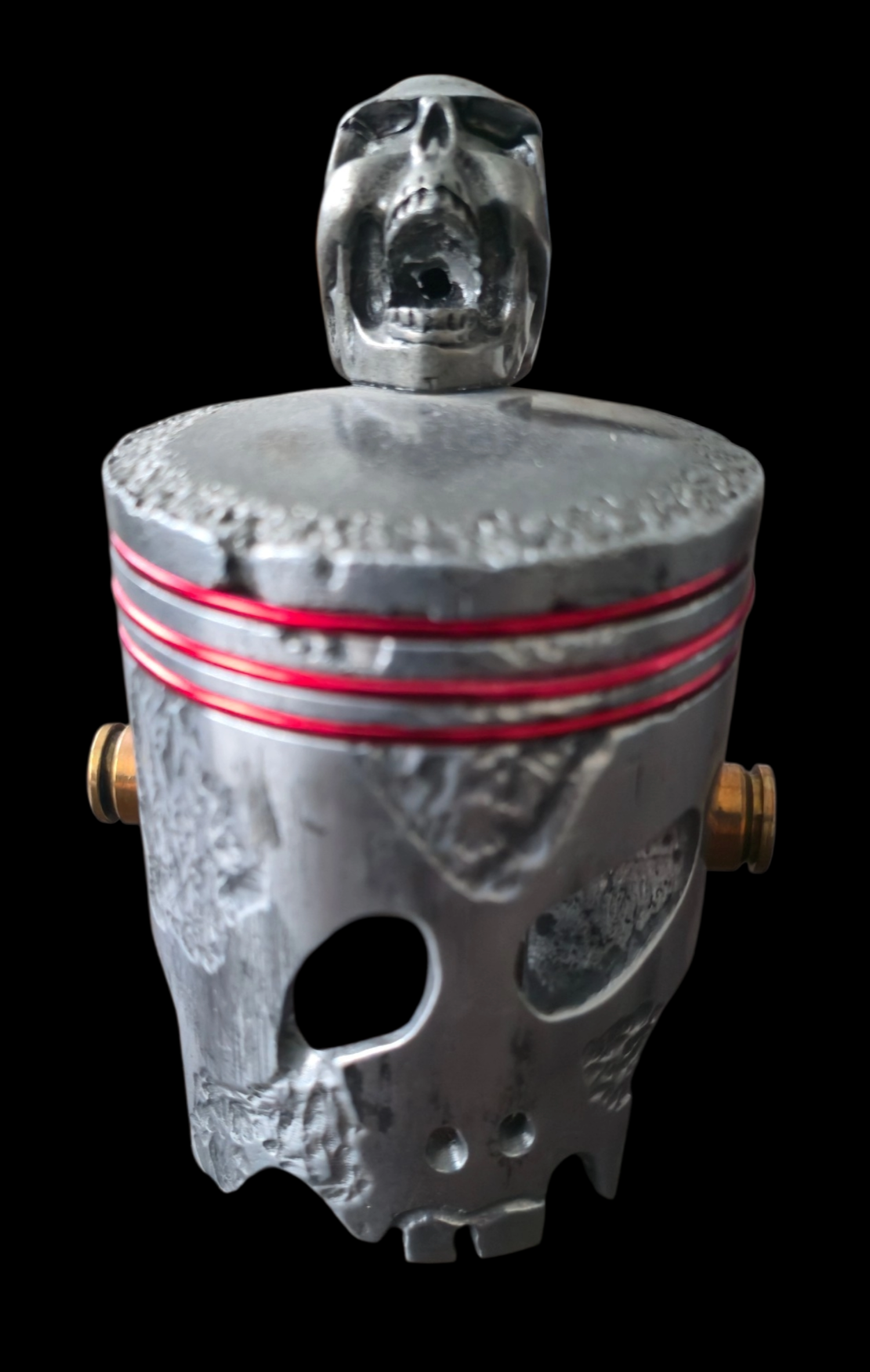 passend dazu ein 1340er Harley Shovelhead Kolben aus den 70er Jahren unter dem Helm,